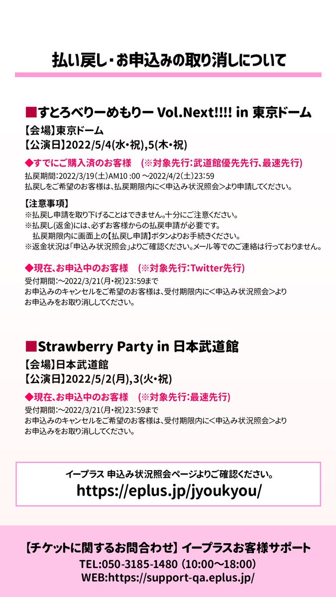 公式SNSで「2022年5月に開催を予定している「Strawberry Party in 日本武道館」「すとろべりーめもりー Vol.Next!!!! in 東京ドーム」両公演につきましては、莉犬、るぅと、ころん、さとみ、ジェルのメンバー5人で開催させていただくことを決定いたしました」と報告。