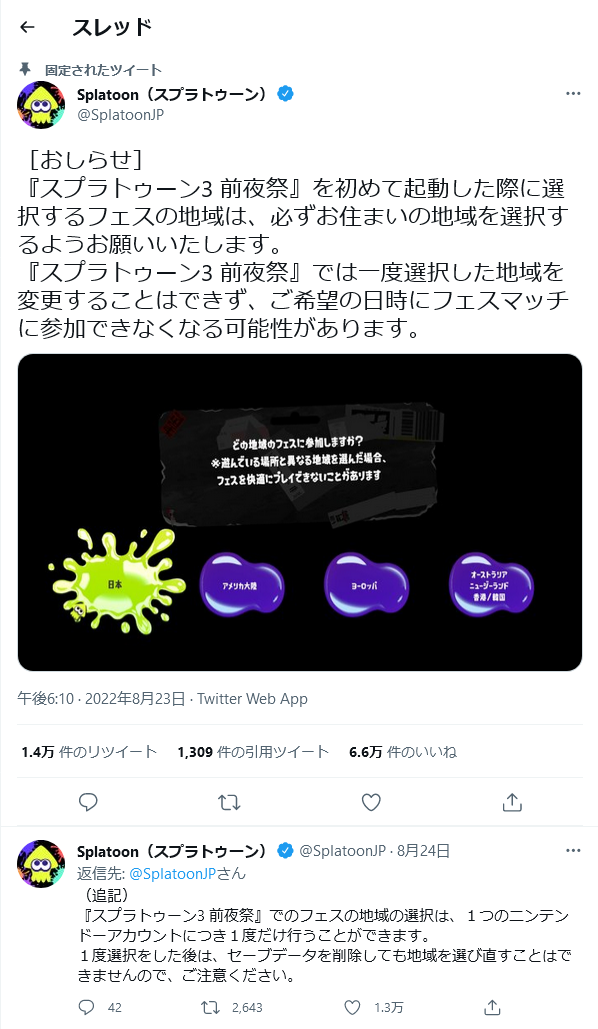 任天堂「スプラ3発売前の前夜祭やるで、日本は8/28の9:00からやで」